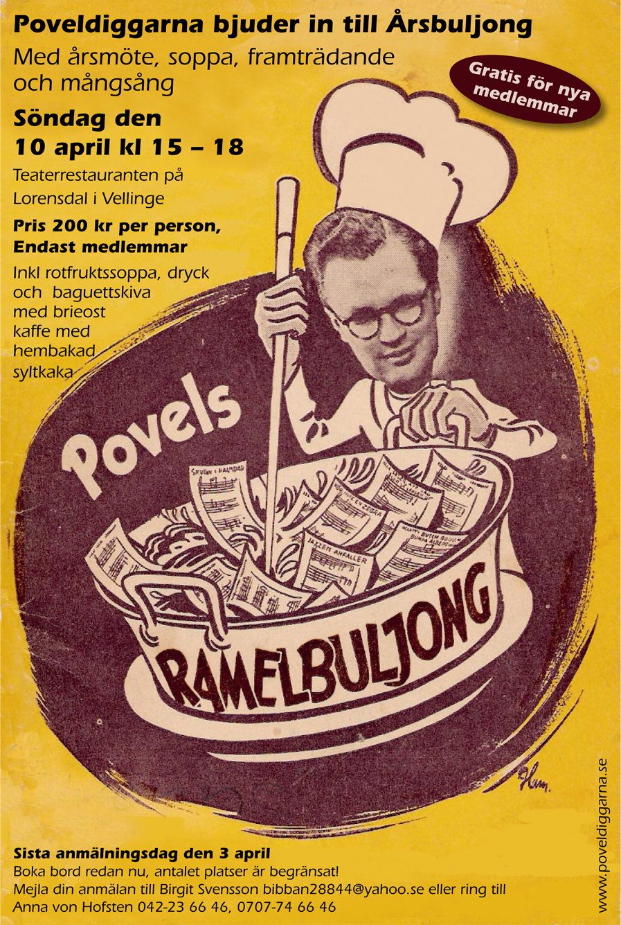 Söndagen den 10 april kl 15-18 är det dax för Povel-Diggarnas Årsbuljong (=Årsmöte+Medlemsbuljong). Vi samlas i den trivsamma teaterrestauranten på Lorensdal i utkanten av Vellinge söder om Malmö. Vägkarta och övrig info - se www.lorensdal.se