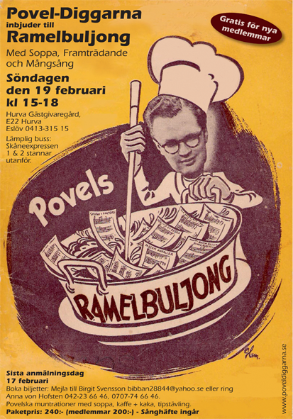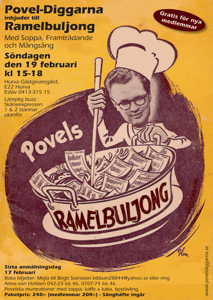 Söndagen den 19 februari kl 15-18 sammanstrålar alla uppknäppta Povel-Diggare till årets första Ramelbuljong, denna gång på det rustika och urskånska Hurva Gästis. Lätt att hitta dit: Ligger någon mil nordost om Lund längs E22. Stor parkering utanför gästgiveriet.