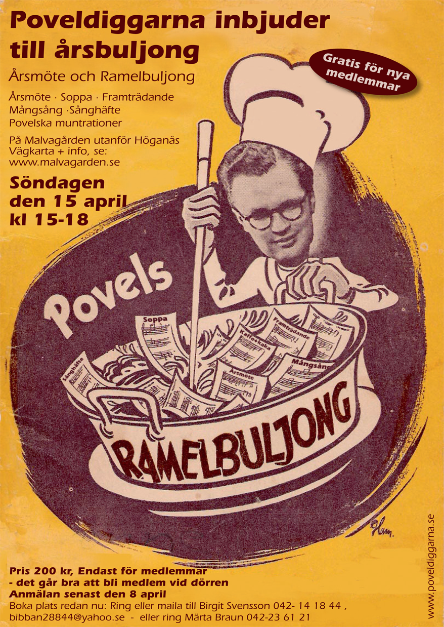 Söndagen den 15april 2012 kl 15-18 är det dax för Povel-Diggarnas Årsbuljong(=Årsmöte+Medlemsbuljong). Vi samlas på den trivsamma och urskånska Malvagårdenstrax norr om Höganäs. Vägkarta+info - se www.malvagarden.se